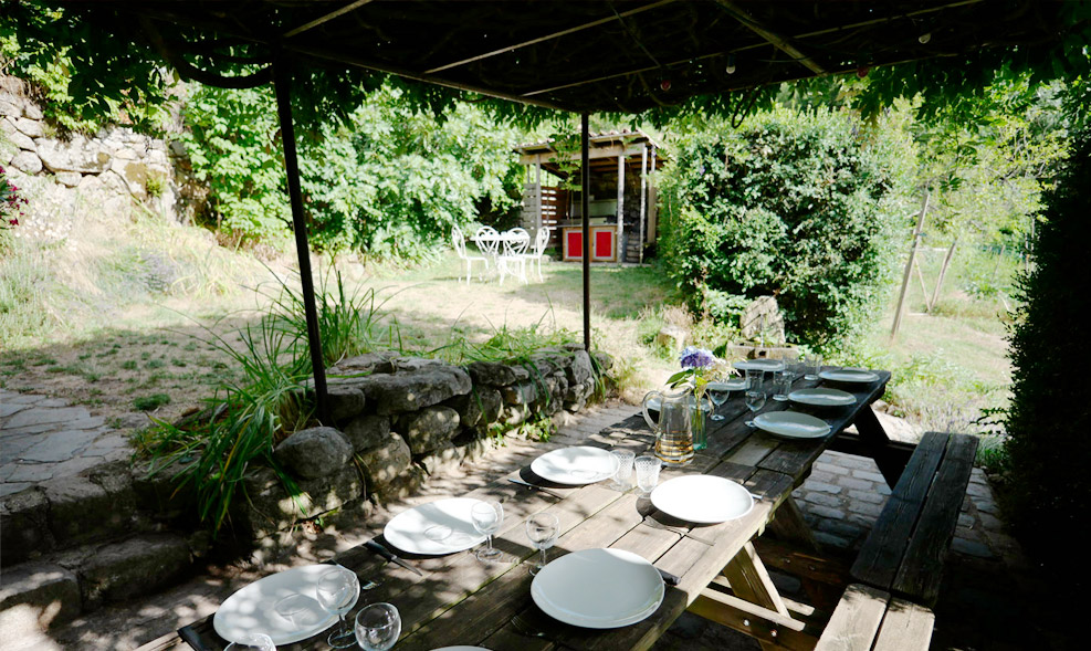 • Eine nach Süden ausgerichtete Terrasse, beschattet von einer jahrhundertealten Glyzinie, lädt Sie zu Mahlzeiten im Garten ein.